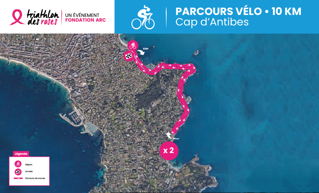 Après la natation, vous rejoindrez le parc à vélo pour enfiler votre casque, votre short et vos baskets afin de partir pour 10 km de vélo en direction du Cap d’Antibes. Pour les équipes en relais c’est dans le parc à vélo que vous passerez le témoin (la puce) à la/au cycliste de l’équipe. Les routes seront fermées à la circulation.
